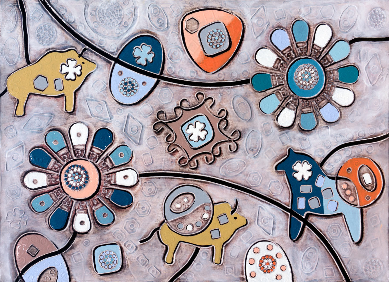Animali spaziali, 2020, cm 50 x 70, olio e ossidi su bassorilievo in fondo gesso su tela