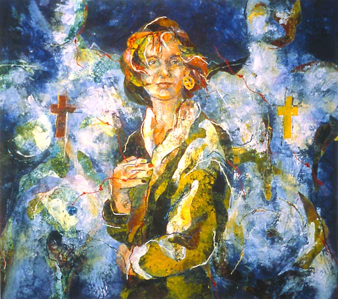 Fotograf: Eget foto Værk titel: At finde sit ståsted Værk type: Stofbillede Materiale: Bemalet, applikeret stofbillede Størrelse: 80 x 100 cm Færdiggjort: 1998