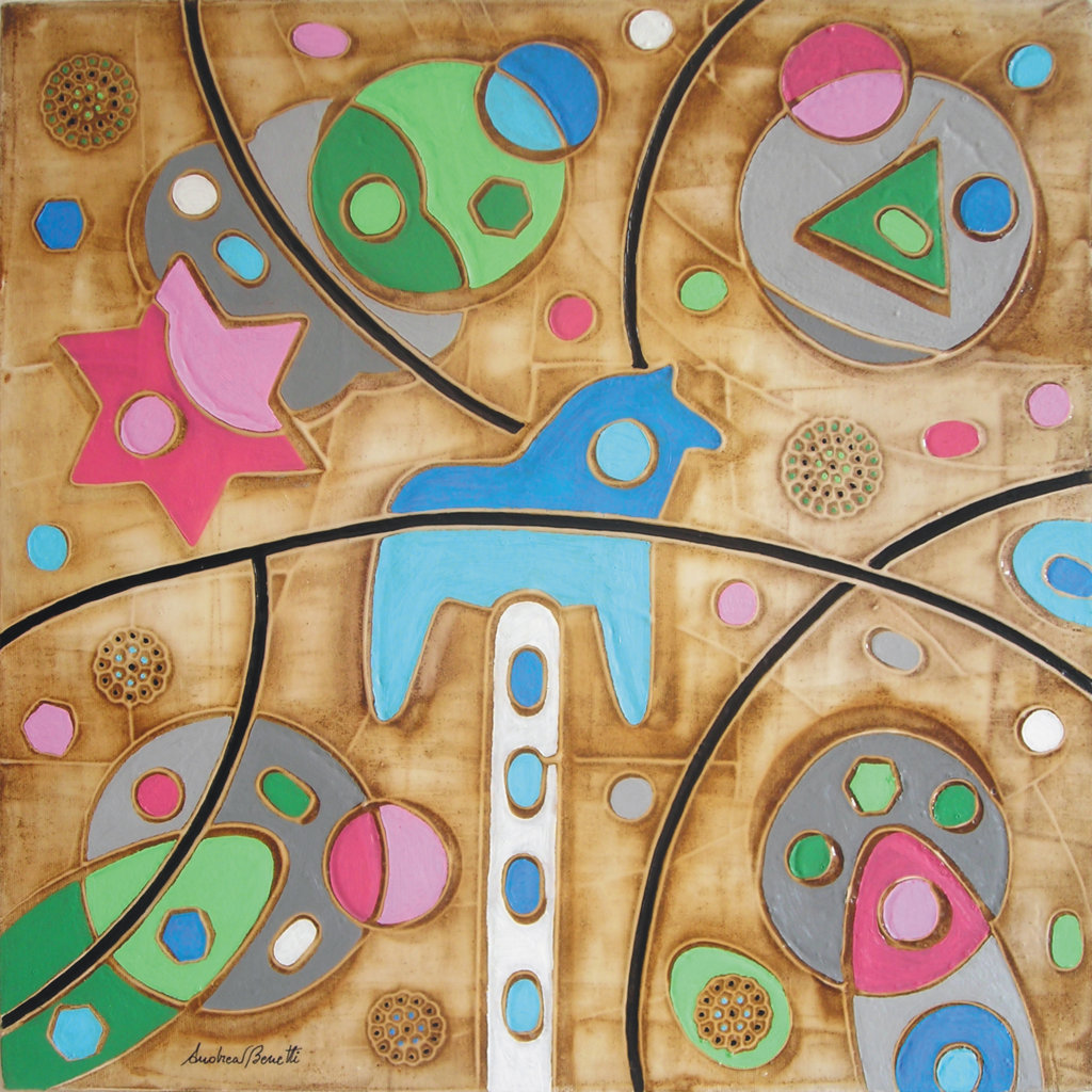 Cavallo a dondolo, 2009, cm 50 x 50, olio e hennè su bassorilievo in fondo gesso su tela Cavallo a dondolo, 2009, cm 50 x 50, oil and henna on bas-relief in plaster on canvas