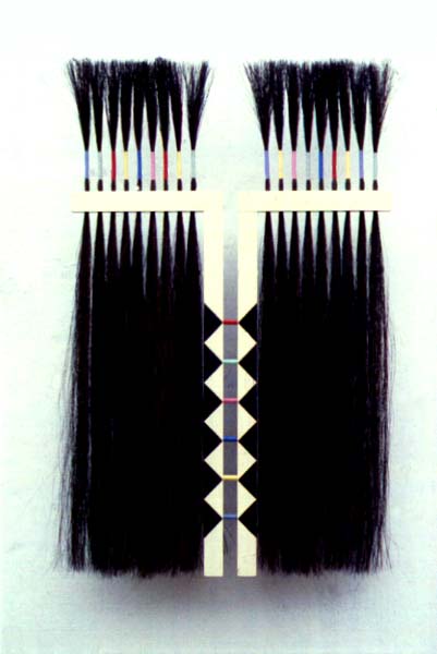 Fotograf: Eget foto Værk titel: Dobbelt galge Værk type: Blandform, skulptur Materiale: Bemalet træ, palmefibre, hør Størrelse: 1,15x0,72 m Færdiggjort: 1991