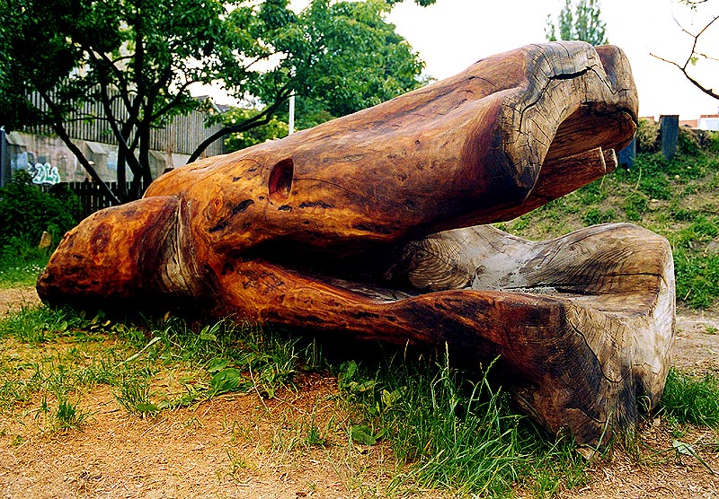 Værk titel: Fabel Værk type: Skulptur Materiale: Elmetræ Størrelse: 100x100x500 cm Færdiggjort: 1999 Placering: Sølystgades Beboerhus, 8000 Århus C