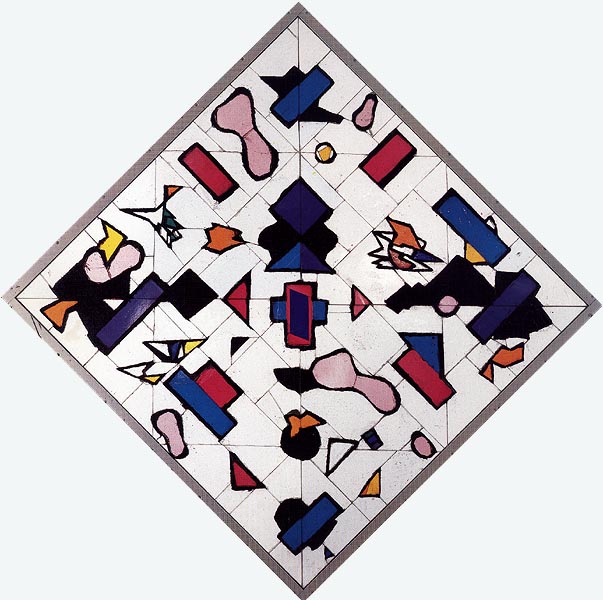 Fotograf: Eget foto Værk titel: Kosmos Værk type: Collage Materiale: Glascollage i blokglas Størrelse: 150 x 150 cm Færdiggjort: 1988