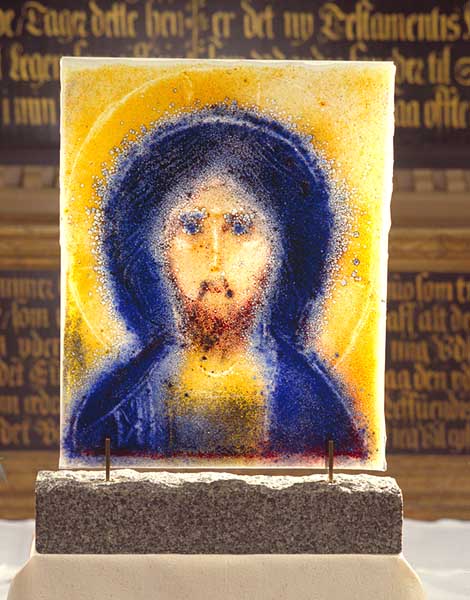 Fotograf: Eget foto Værk titel: Kristus billed Værk type: Glasmaleri Materiale: Glas og granit Størrelse: 40 x 32 cm Færdiggjort: 2000