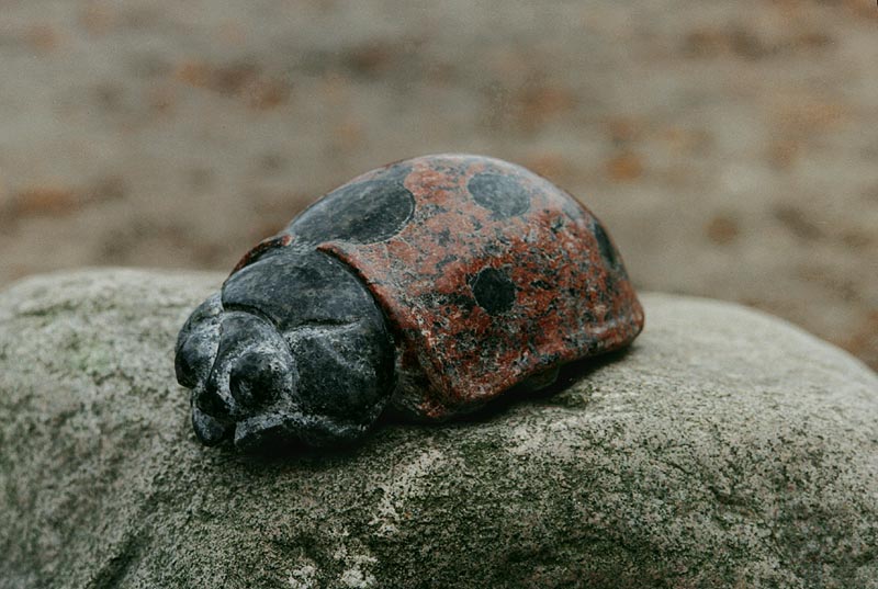Fotograf: Tine Borring Værk titel: Mariehøne Værk type: Skulptur Materiale: Rød og sort granit Størrelse: Ca. 22x15x12 cm Færdiggjort: 1997 Placering: Privateje
