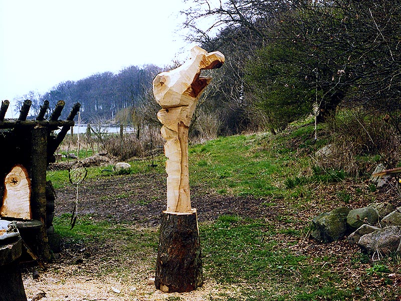 Fotograf: Eget foto Værk titel: Offerdyr/Himmelhund Værk type: Skulptur Materiale: Kastanjetræ Størrelse: 200x40x60 cm Færdiggjort: 1999 Øvrigt: Brændt - september 1999