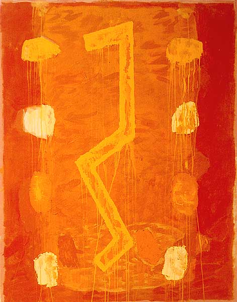Fotograf: Eget foto Værk titel: Orange med gule tegn Værk type: Maleri Materiale: Acryl på lærred Størrelse: 130 x 100 cm Færdiggjort: 1999