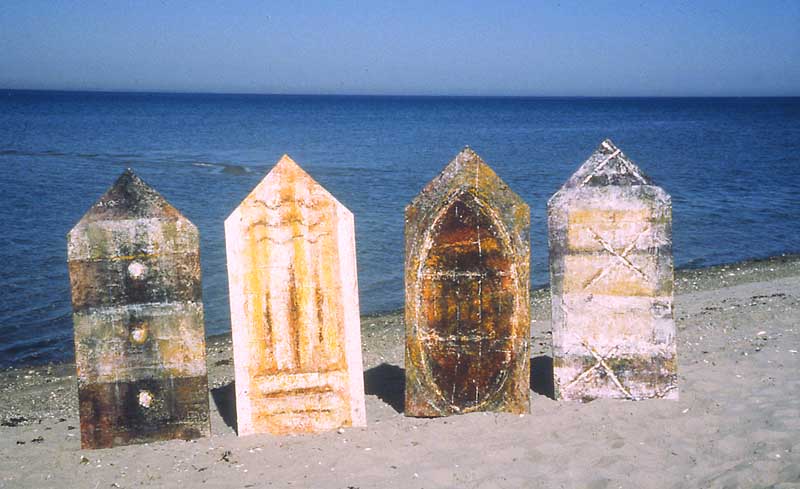 Fotograf: Eget foto Værk titel: Skjold Værk type: Maleri Materiale: Bemalet, håndlavet papir Størrelse: 130 x 60 cm Færdiggjort: 1999 Øvrigt: størrelse og pris pr. stk.