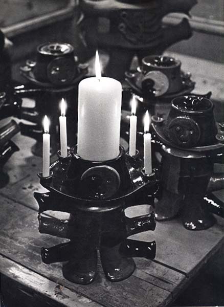 Fotograf: Regnecentralen Værk titel: Sprællemænd Værk type: Lysestager Materiale: Begittet lertøj Størrelse: Højde ca. 30 cm Færdiggjort: 1970 Placering: A/S Regnecentralen